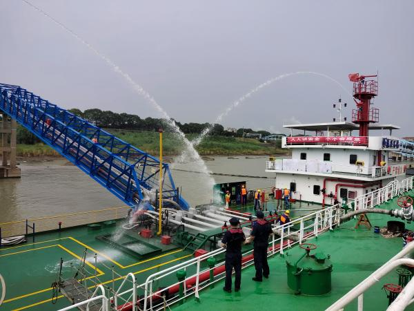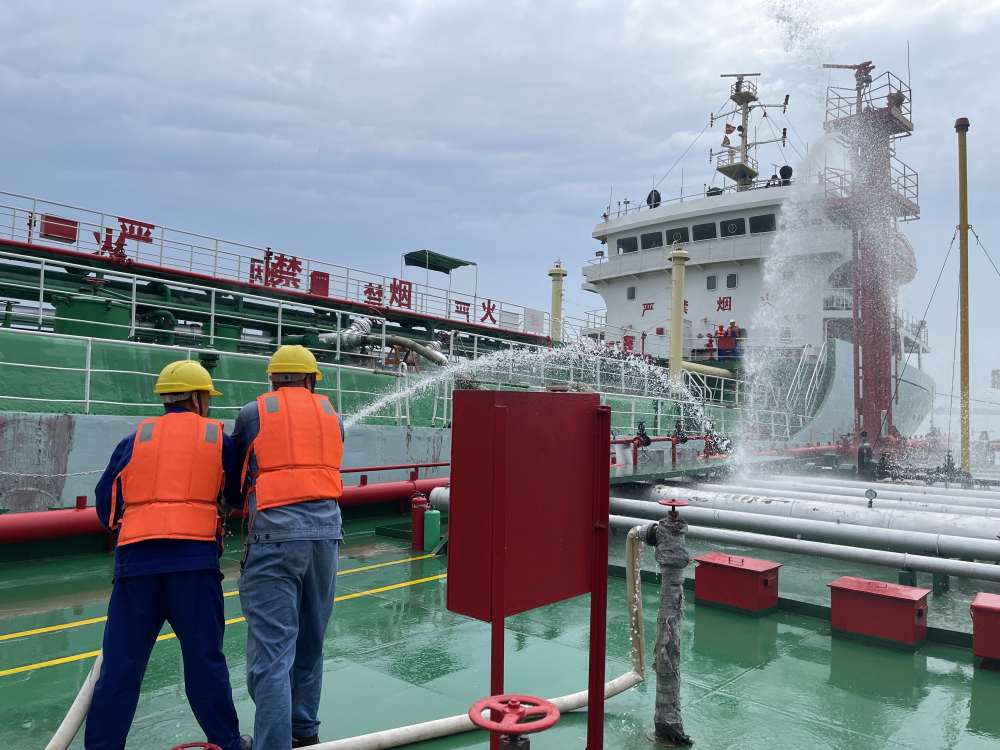 本次应急演练模拟一艘卸货沥青船由于线路老化,生活舱起火,迅速点燃装饰材料,火势愈演愈烈,沥青船立即停止作业展开自救的同时向码头求援。过程中,有一名船员在救火战斗中手臂烫伤,公司按人身伤害现场处置预案进行救治。