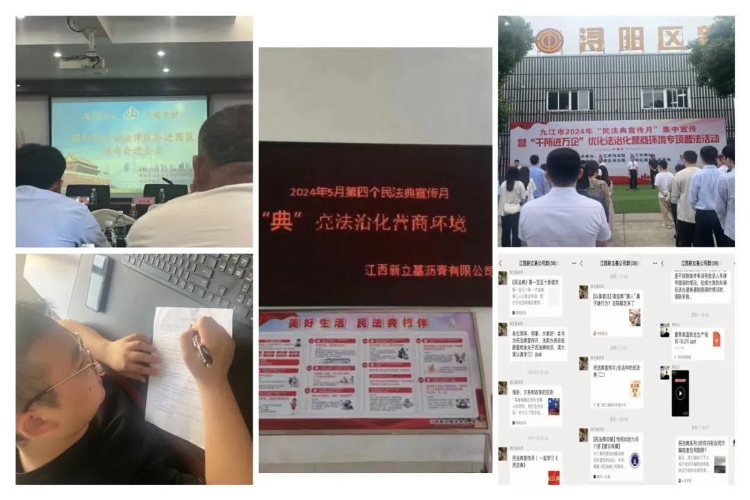 江西新立基组织职工参加“浔阳区公安法律服务进园区进商会进企业”活动与区司法局组织的九江市2024年民法典宣传月集中宣传暨浔阳区“千所进万企”优化法治化营商环境专项普法活动。法务办在公司群里不定时开展民法典相关知识及条例宣传教育,结合安全生产月向员工普及了民法典中关于应急管理、安全生产、合法经营的相关法律知识,并通过知识小测验的形式,加深了员工对民法典的认识和理解,营造了公司良好的遵法学法守法用法的氛围。