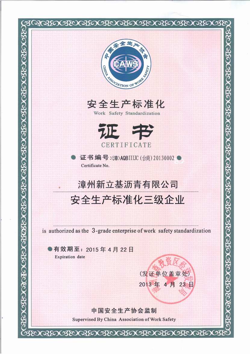 * 2013年6月5日漳州新立基沥青有限公司正式获取由漳州台商投资区经济发展局核发的安全生产标准化三级企业证书,自从我司引入安全生产标准化管理,库区已经运行了近一年时间,公司安监部将以此为契机在安全月加强与库区的宣传、与大家共同努力,在安全工作上取得有效进步。