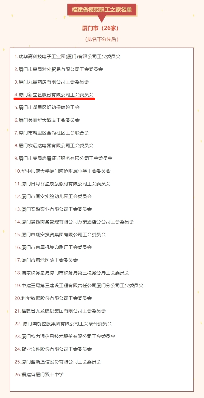 近日,3044永利集团工会被福建省总工会授予了“福建省模范职工之家”荣誉称号。据悉,“福建省模范职工之家”荣誉称号由福建省总工会设立,是福建省工会系统对基层工会工作的最高褒奖。本次福建省总工会共授予了198个集体“福建省模范职工之家”称号,其中厦门市有26个集体上榜,3044永利集团位列其中。